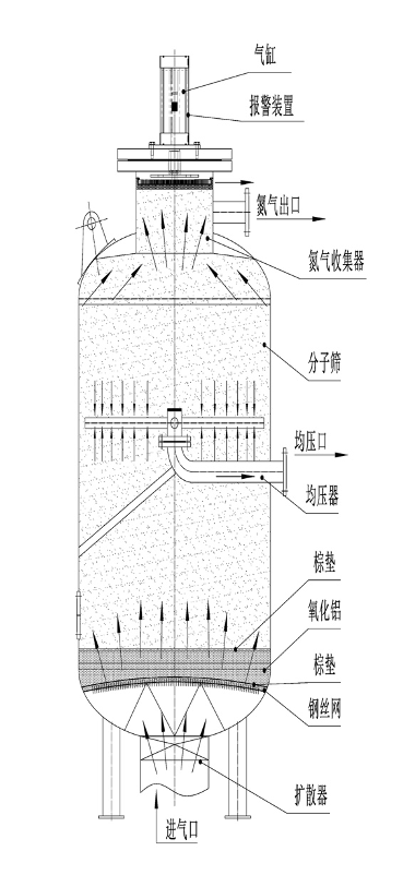 此外,分子筛的装填质量也会影响吸附效果。专业的密相装填技术能确保分子筛床层紧密、无沟流。装填不实会导致气流短路,大量氧气未被吸附即穿透,导致回收率暴跌与空氮比急剧恶化。比如盛尔采用旋风式气流扩散器,吸附塔下部设有特殊的气流扩散分布装置,使气体在扩散时呈“S”螺旋形流动,和碳分子筛接触时呈“W”形流动,这不仅大大降低了气体对碳分子筛的冲击力,也使气体在吸附过程中更加均匀,并有效防止吸附“死角”和产生隧道效应,有利于提高氮气纯度和保证碳分子筛的使用寿命。